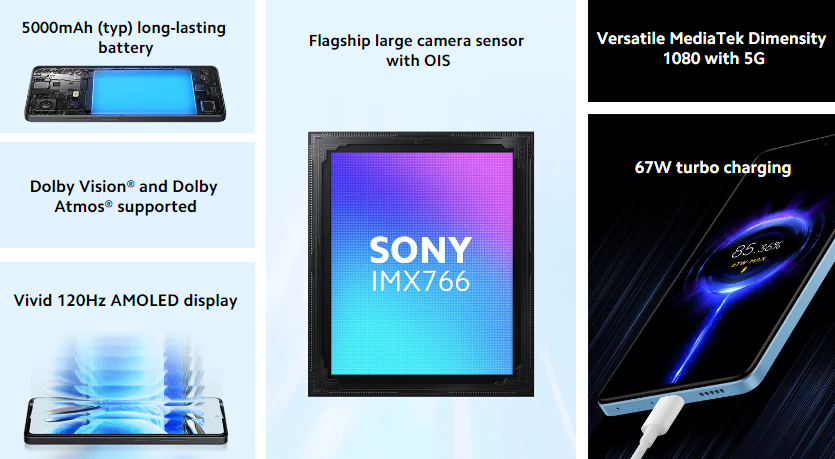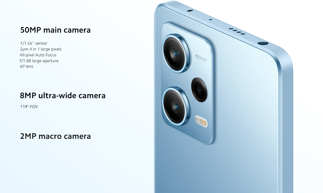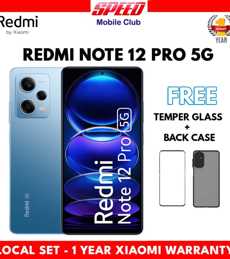 Redmi Note 12 Pro 5GKey Fuatures 50MP Sony IMX 766 Camera + OIS Triple Camera Setup Experience extraordinary visuals on the 120Hz Pro AMOLED Displaywith variable refresh rate which automatically switches to match the content on the screen Massive 5000mAh BatteryFull Day's Charge In 15 Minutes Powerful performance with MediaTek Dimensity 1080 5G 8GB RAM+256GB ROM