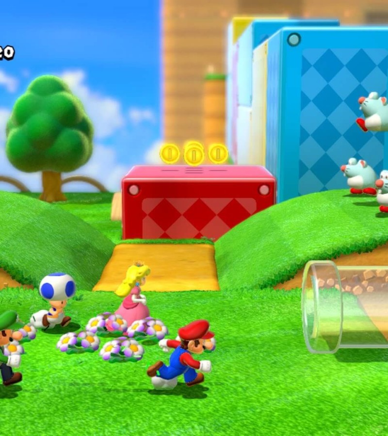 In Super Mario 3D World, choose from Mario, Luigi, Peach, and Toad and set off to save the Sprixie Kingdom. Each character has a distinct playstyle—Luigi can jump extra high and Peach can float for a short time. Rosalina is also available as a playable character later in the game! Jump, dash, and pounce to reach the goal while collecting Green Stars, coins and power-ups.
