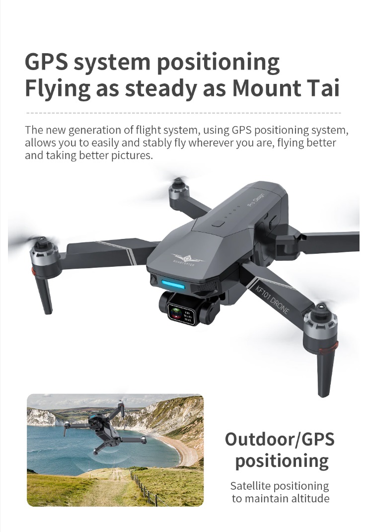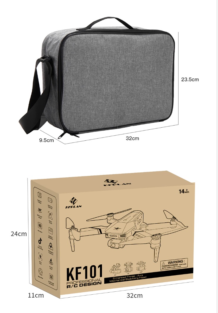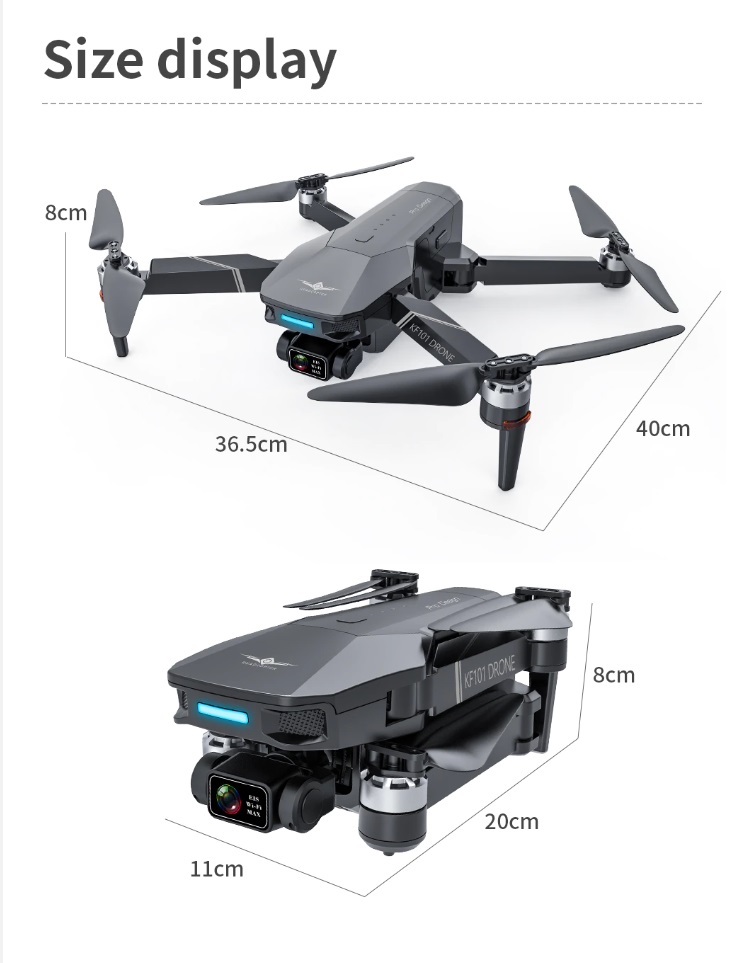 Item No: KF101 MAX Color :Dark Grey Frequency :2.4G (Remote Control) & 5G (Mobile Phone) Drone Battery :11.1V 2500mAh  Control Distance : 3KM For KF101 MAX Wifi Image Transmission Distance : 3KM  Flight Time :  About 25 min  Charging Time : About 6 hours USB Charging :  5V/2A Drone Weight : 613g (Needs drone registration in Singapore) Remote Control Battery : 3.7V 1000mAh Transmitter Charging Time : About 60min Transmitter Operating Time :  About 10 hours Camera : 3 -Axis Electronic Stabilization Gimbal EIS electronic image stabilization Camera Camera Lens :  120° Photo Resolution (APP) :  3840*2160 P Video Resolution (APP) :  1280*720 P Photo Resolution (SD Card) :  2560*1440 P Video Resolution (SD Card) :   2560*1440 P Frame Rate : 30fps Photo Format : JPG Video Format : MP4 or AVI Adjustable Angle :90° Gesture Shooting : 1-3 M GPS Follow Me :  30 M+ SD Card Supports 32G-128G(Not Included) Mobile Device System Version : iOS 8.0 or later / Android 4.4.4 or later