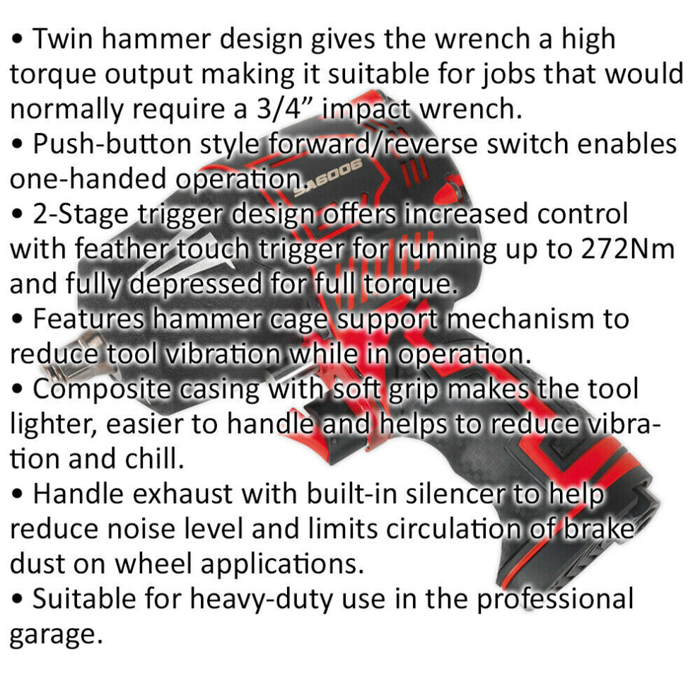• Twin hammer design gives the wrench a high torque output making it suitable for jobs that would normally require a 3/4" impact wrench.