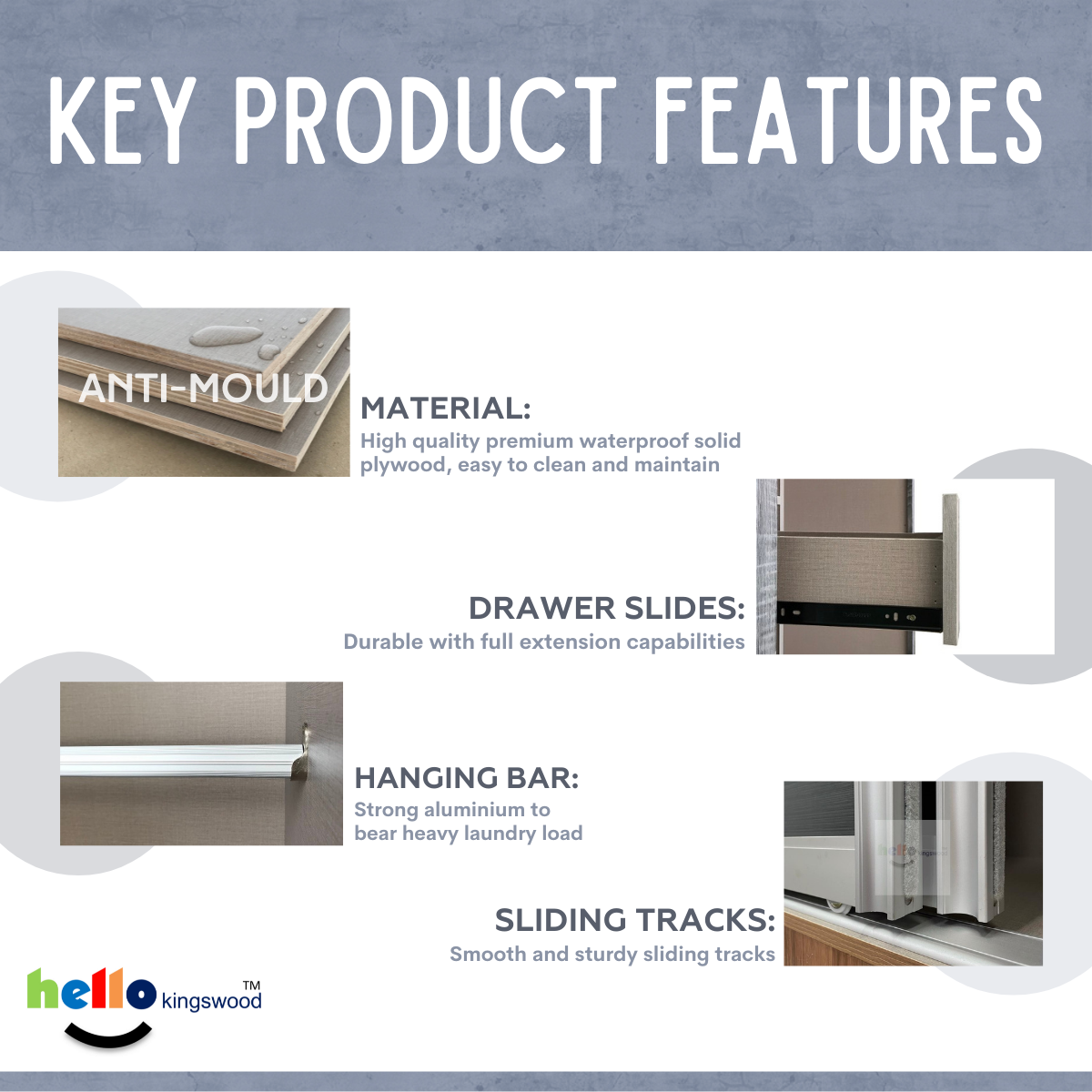 12 months manufacturer warranty Material: Solid Plywood Sturdy aluminium door frame Strong aluminium hanging bar Durable full extension drawer slides Width: 4.5, 5, 5.5, 6ft Height: 1.97m or 2.4m Depth: 60cm Models: Timo, Niko, Scanik, Megan, Joshua Available in 9 trendy colours